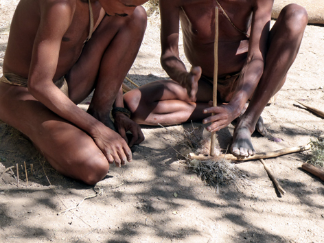 die San-Buschmänner machen Feuer |